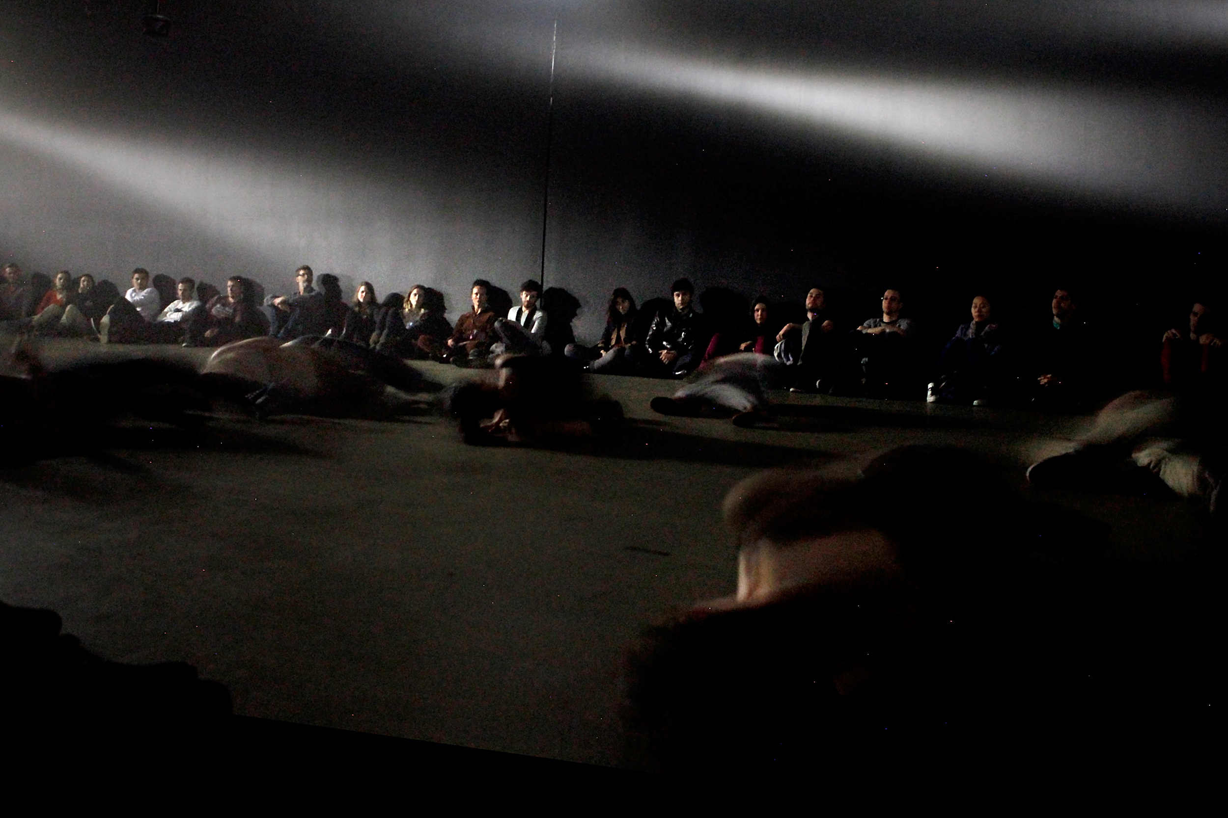 The prone performers engage in a series of rocking, undulating and rolling movements which move their lips back and forth past hanging microphones. Breath rhythms gradually transform into new movements and new rhythms as the microphones fill the room with the enlarged but intimate sounds of the breath. The performers lay in a subtly changing island of light in the middle of a dark room. The darkness between the walls and the performers is a space of contemplation for the audience.